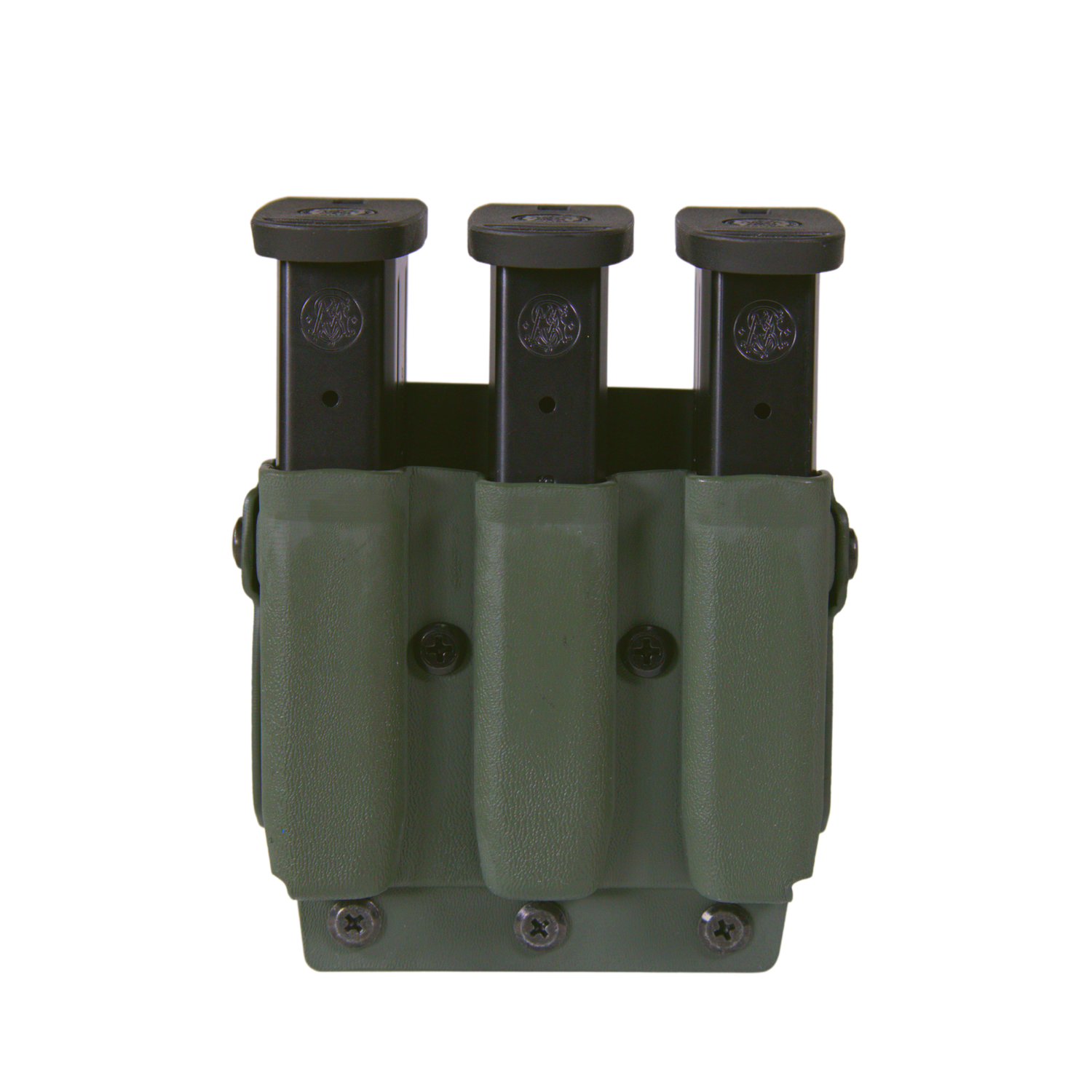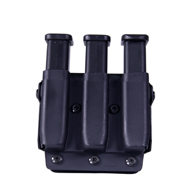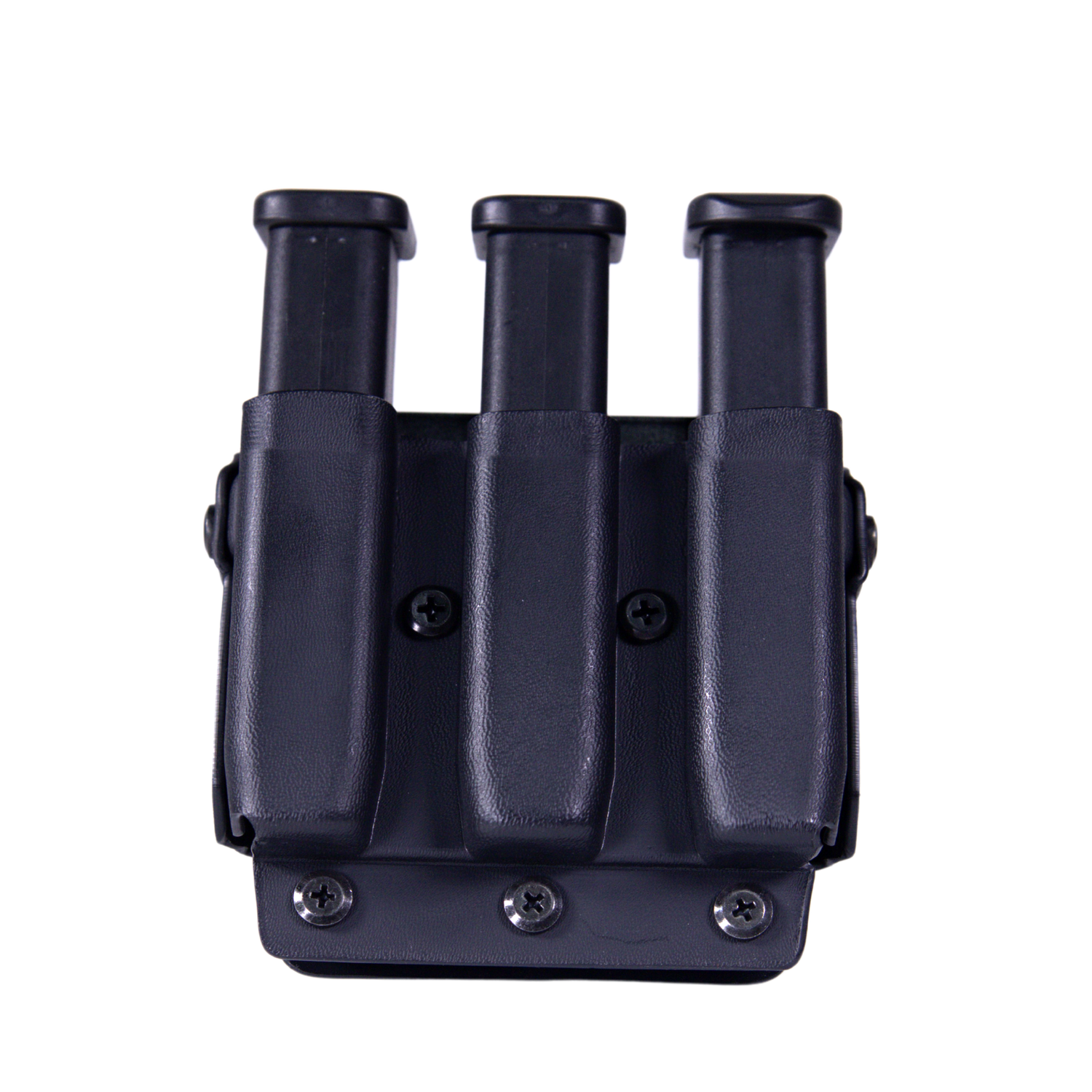 The Uniform Line Triple Pistol Mag Carrier is made from aircraft grade Kydex making it durable with a sleek duty appearance. It is offered in 3 sizes, allowing for a wider range of mags per model. The bullets out design creates our slimmest footprint for three mags, which is the most efficient use of space. There are three points of adjustment for a dialed retention in each mag. It has a flared mag well and raised sweat shield for easier mag indexing. It comes shipped either with HSGI® universal clips, or a dedicated PLM (Push Lock Mechanism) belt mount option. It has a hole pattern that allows for diverse mounts and cants with other Comp-Tac accessories.